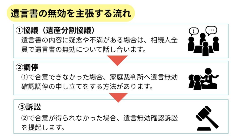 遺言書の内容に不満があり遺言書の無効を主張する場合、まずは相続人同士で協議し合意を得る方法が考えられます。